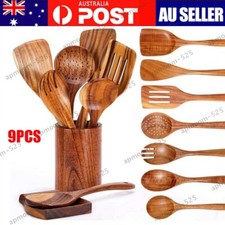 9-Piece Kitchen Utensils Set: A complete wood kitchen utensils that features all the essential cooking tools including a flat spatula, fried spatula, slotted spatula, kitchen utensil holder, spoons rest, strainer spoon, salad fork, salad spoon, mixing spoon.