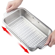 7 Seperate organisers: Dish rack, Bowl rack, Chopping board rack, Knife holder, Sponge/detergent holder, cutlery/Utensil holder and 5 removable hooks. Over The Sink Stainless Steel Dish Rack. Material: Stainless Steel.
